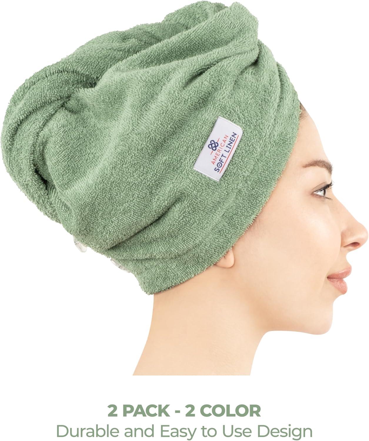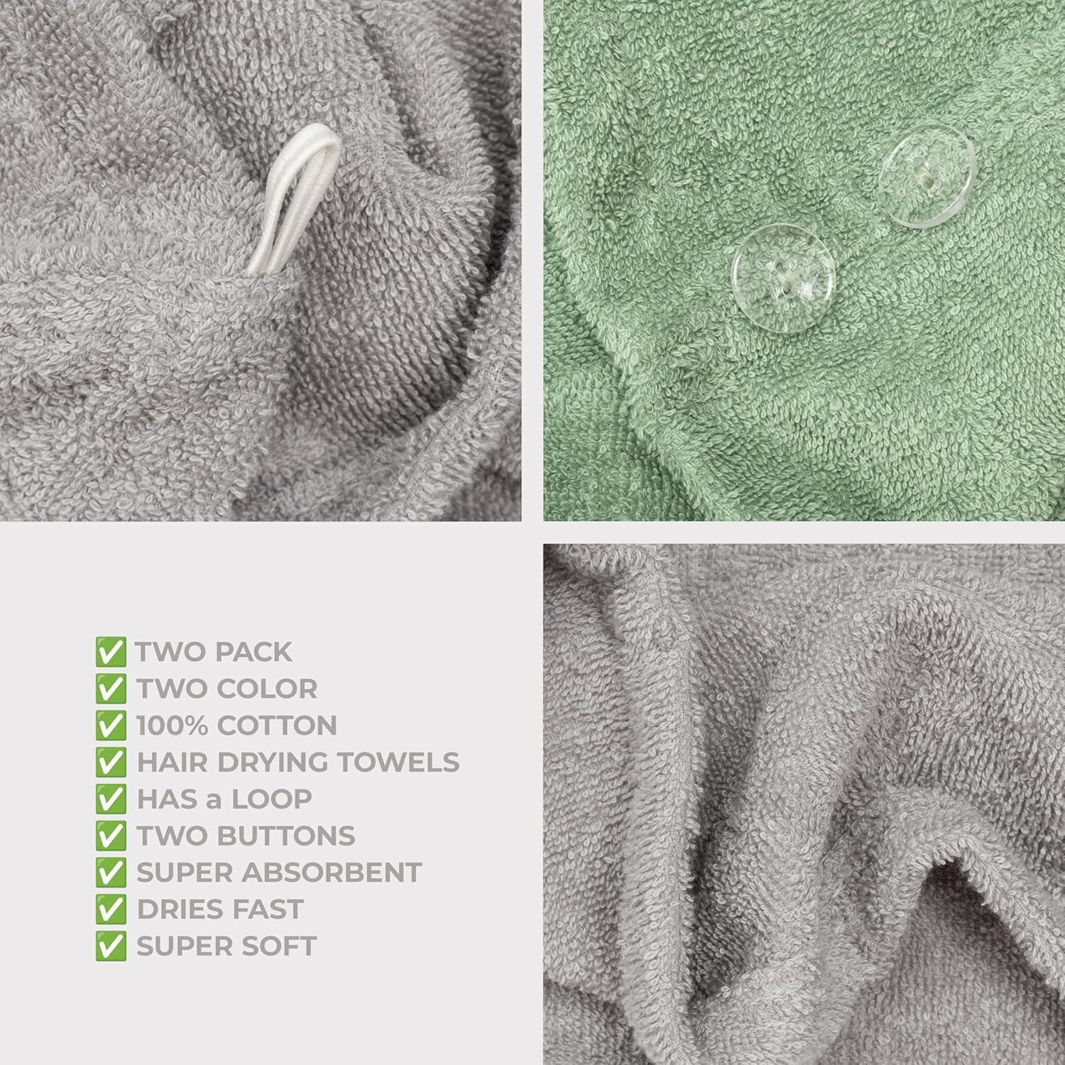 American Soft Linen 100% Cotton Hair Towels for Women, Head Towel Cap, Cotton Hair Turban Towel Wrap for Long Curly Anti Frizz Hair, Soft and Absorbent Cotton Hair Towels 2 Pack, White(Light Grey - Sage)