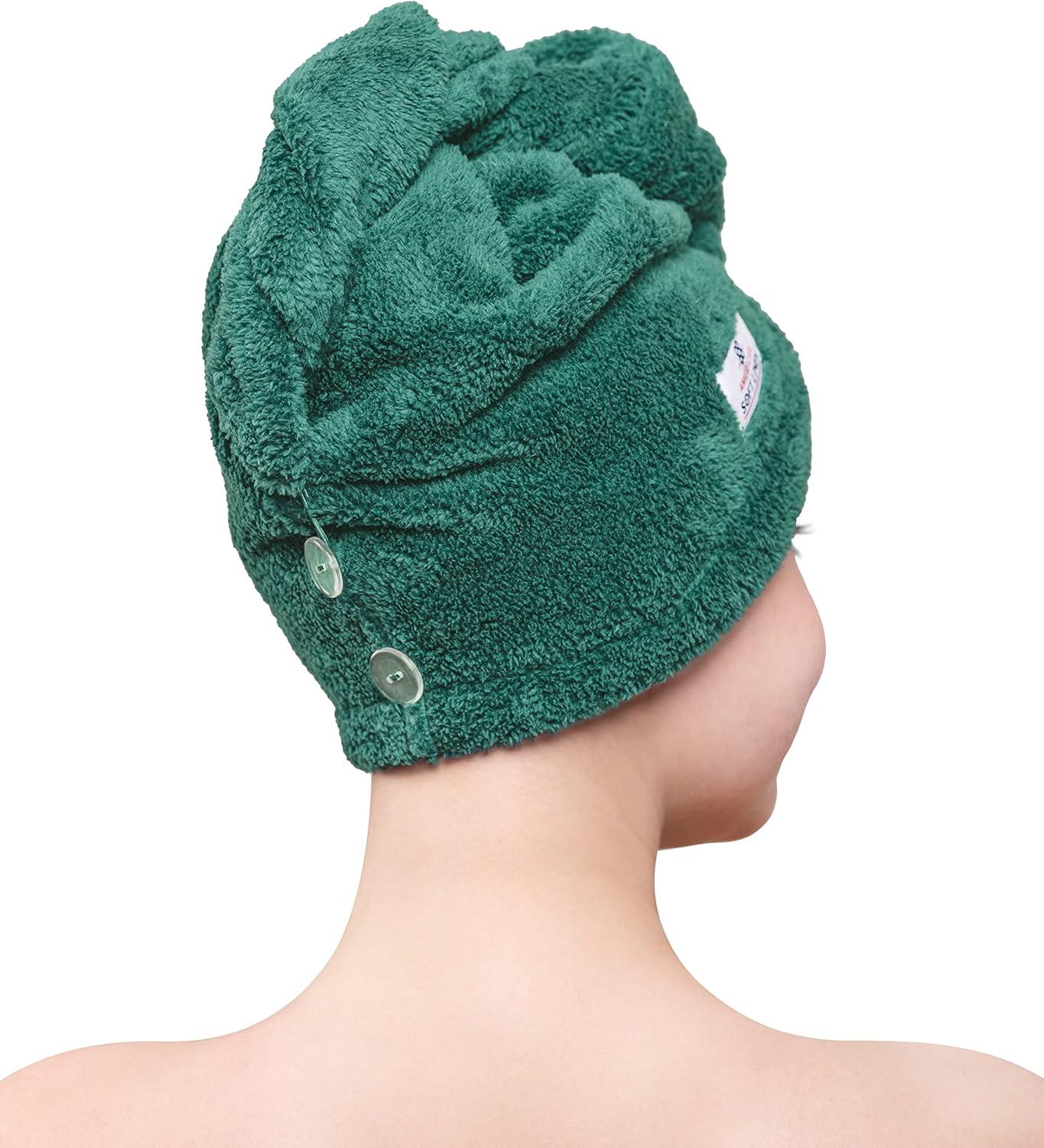 ✅ Head Towel Cap with sizes 10 by 25 inches, large enough for most big head, long, curly, anti frizz hairs. You can also adjust to your size with two-button design. One size fits kids and adults.